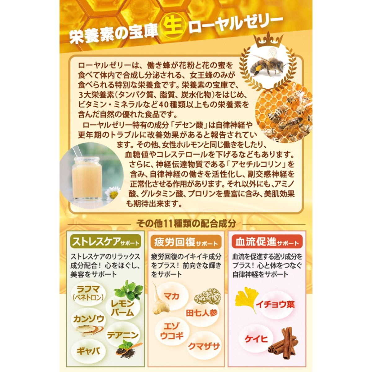 鮮度の高い良質な「生ローヤルゼリー」2,000mgを主成分に、バランスサポート成分11種類を加えた、心と体の美と健やかさをサポートするドリンクです。