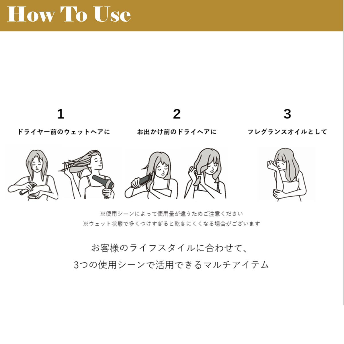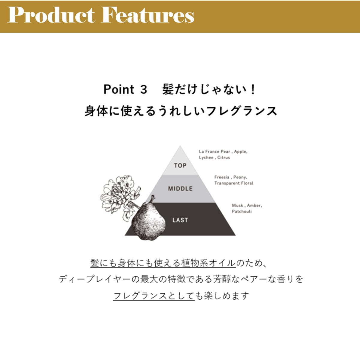 PG、エタノール、水、ミリスチルアルコール、セトリモニウムクロリドベタインヒドロキシエチルウレア、バオバブ種子エキス、ゼイン、シクロヘキサン-1,4-ジカルボン酸ビスエトキシジグリコール、加水分解ケラチン(羽毛)、ベヘントリモニウムクロリド、イソステアリルグリセリル、ジラウロイルグルタミン酸リシンNa、乳酸、イソプロパノール、DPG、香料